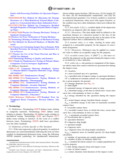 SIGNIFICANCE AND USE 5.1 Susceptibility to damage from concentrated out-of-plane impact forces is one of the major design concerns of many structures made of advanced composite laminates. Knowledge of the damage resistance properties of a laminated composite plate is useful for product development and material selection. 5.2 Drop-weight impact testing can serve the following purposes: 5.2.1 To establish quantitatively the effects of stacking sequence, fiber surface treatment, variations in fiber volume fraction, and processing and environmental variables on the damage resistance of a particular composite laminate to a concentrated drop-weight impact force or energy. 5.2.2 To compare quantitatively the relative values of the damage resistance parameters for composite materials with different constituents. The damage response parameters can include dent depth, damage dimensions, and through-thickness locations, F1, Fmax, E1, and Emax, as well as the force versus time curve. 5.2.3 To impart damage in a specimen for subsequent damage tolerance tests, such as Test Method D7137/D7137M. 5.3 The properties obtained using this test method can provide guidance in regard to the anticipated damage resistance capability of composite structures of similar material, thickness, stacking sequence, and so forth. However, it must be understood that the damage resistance of a composite structure is highly dependent upon several factors, including geometry, thickness, stiffness, mass, support conditions, and so forth. Significant differences in the relationships between impact force/energy and the resultant damage state can result due to differences in these parameters. For example, properties obtained using this test method would more likely reflect the damage resistance characteristics of an unstiffened monolithic skin or web than that of a skin attached to substructure which resists out-of-plane deformation. Similarly, test specimen properties would be expected to be similar to those of a ... SCOPE 1.1 This test method determines the damage resistance of multidirectional polymer matrix composite laminated plates subjected to a drop-weight impact event. The composite material forms are limited to continuous-fiber reinforced polymer matrix composites, with the range of acceptable test laminates and thicknesses defined in 8.2. 1.1.1 Instructions for modifying these procedures to determine damage resistance properties of sandwich constructions are provided in Practice D7766/D7766M. 1.2 A flat, rectangular composite plate is subjected to an out-of-plane, concentrated impact using a drop-weight device with a hemispherical impactor. The potential energy of the drop-weight, as defined by the mass and drop height of the impactor, is specified prior to test. Equipment and procedures are provided for optional measurement of contact force and velocity during the impact event. The damage resistance is quantified in terms of the resulting size and type of damage in the specimen. 1.3 The test method may be used to screen materials for damage resistance, or to inflict damage into a specimen for subsequent damage tolerance testing. When the impacted plate is tested in accordance with Test Method D7137/D7137M, the overall test sequence is commonly referred to as the Compression After Impact (CAI) method. Quasi-static indentation per Test Method D6264/D6264M may be used as an alternate method of creating damage from an out-of-plane force and measuring damage resistance properties. 1.4 The damage resistance properties generated by this test method are highly dependent upon several factors, which include specimen geometry, layup, impactor geometry, impactor mass, impact force, impact energy, and boundary conditions. Thus, results are generally not scalable to other configurations, and are particular to the combination of geometric and physical conditions tested. 1.5 Units—The values stated in either SI units or inch-poun...