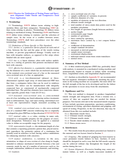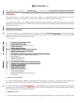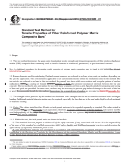 SIGNIFICANCE AND USE 5.1 This test method is designed to produce longitudinal tensile strength and elongation data. From a tension test, a variety of data are acquired that are needed for design purposes. Test factors relevant to the measured tensile response of bars include specimen preparation, specimen conditioning, environment of testing, specimen alignment and gripping, and speed of testing. Properties, in the test direction, that may be obtained from this test method include: 5.1.1 Maximum tensile force, 5.1.2 Ultimate tensile strength, 5.1.3 Ultimate tensile strain, 5.1.4 Tensile chord modulus of elasticity, and 5.1.5 Stress-strain curve. SCOPE 1.1 This test method determines the quasi-static longitudinal tensile strength and elongation properties of fiber reinforced polymer matrix (FRP) composite bars commonly used as tensile elements in reinforced, prestressed, or post-tensioned concrete. Note 1: Additional procedures for determining tensile properties of polymer matrix composites may be found in Test Methods D3039/D3039M and D3916. 1.2 Linear elements used for reinforcing Portland cement concrete are referred to as bars, rebar, rods, or tendons, depending on the specific application. This test method is applicable to all such reinforcements within the limitations noted in the method. The test articles are referred to as bars in this test method. In general, bars have solid cross-sections and a regular pattern of surface undulations or a coating of bonded particles, or both, that promote mechanical interlock between the bar and concrete. The test method is also appropriate for use with linear segments cut from a grid. Specific details for preparing and testing of bars and grids are provided. In some cases, anchors may be necessary to prevent grip-induced damage to the ends of the bar or grid. Suggestions for a grouted type of anchor are provided in Appendix X1. 1.3 The strength values provided by this method are short-term static strengths that do not account for sustained static or fatigue loading. Additional material characterization may be required, especially for bars that are to be used under high levels of sustained or repeated loading. 1.4 Units—The values stated in either SI units or inch-pound units are to be regarded separately as standard. The values stated in each system are not necessarily exact equivalents; therefore, to ensure conformance with the standard, each system shall be used independently of the other, and values from the two systems shall not be combined. 1.4.1 Within the text, the inch-pound units are shown in brackets. 1.5 This standard does not purport to address all of the safety concerns, if any, associated with its use. It is the responsibility of the user of this standard to establish appropriate safety, health, and environmental practices and determine the applicability of regulatory limitations prior to use. 1.6 This international standard was developed in accordance with internationally recognized principles on standardization established in the Decision on Principles for the Development of International Standards, Guides and Recommendations issued by the World Trade Organization Technical Barriers to Trade (TBT) Committee.