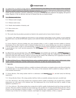 1.2 Linear elements used for reinforcing Portland cement concrete are referred to as bars, rebar, rods, or tendons, depending on the specific application. This test method is applicable to all such reinforcements within the limitations noted in the method. The test articles are referred to as bars in this test method. In general, bars have solid cross-sections and a regular pattern of surface undulations or a coating of bonded particles, or both, that promote mechanical interlock between the bar and concrete. The test method is also appropriate for use with linear segments cut from a grid. Specific details for preparing and testing of bars and grids are provided. In some cases, anchors may be necessary to prevent grip-induced damage to the ends of the bar or grid. Suggestions for a grouted type of anchor are provided in Appendix X1.