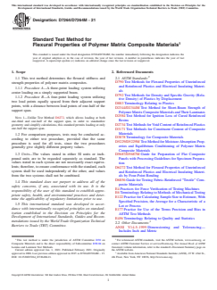 ASTM D7264/D7264M-21 is a standard published by ASTM International. Its full title is "Standard Test Method for Flexural Properties of Polymer Matrix Composite Materials". This standard covers: SIGNIFICANCE AND USE 5.1 This test method determines the flexural properties (including strength, stiffness, and load/deflection behavior) of polymer matrix composite materials under the conditions defined. Procedure A is used for three-point loading and Procedure B is used for four-point loading. This test method was developed for optimum use with continuous-fiber-reinforced polymer matrix composites and differs in several respects from other flexure methods, including the use of a standard span-to-thickness ratio of 32:1 versus the 16:1 ratio used by Test Methods D790 (a plastics-focused method covering three-point flexure) and D6272 (a plastics-focused method covering four-point flexure). 5.2 This test method is intended to interrogate long-beam strength in contrast to the short-beam strength evaluated by Test Method D2344/D2344M. 5.3 Flexural properties determined by these procedures can be used for quality control and specification purposes, and may find design applications. 5.4 These procedures can be useful in the evaluation of multiple environmental conditions to determine which are design drivers and may require further testing. 5.5 These procedures may also be used to determine flexural properties of structures. SCOPE 1.1 This test method determines the flexural stiffness and strength properties of polymer matrix composites. 1.1.1 Procedure A—A three-point loading system utilizing center loading on a simply supported beam. 1.1.2 Procedure B—A four-point loading system utilizing two load points equally spaced from their adjacent support points, with a distance between load points of one-half of the support span. Note 1: Unlike Test Method D6272, which allows loading at both one-third and one-half of the support span, in order to standardize geometry and simplify calculations, this standard permits loading at only one-half the support span. 1.2 For comparison purposes, tests may be conducted according to either test procedure, provided that the same procedure is used for all tests, since the two procedures generally give slightly different property values. 1.3 Units—The values stated in either SI units or inch-pound units are to be regarded separately as standard. The values stated in each system are not necessarily exact equivalents; therefore, to ensure conformance with the standard, each system shall be used independently of the other, and values from the two systems shall not be combined. 1.4 This standard does not purport to address all of the safety concerns, if any, associated with its use. It is the responsibility of the user of this standard to establish appropriate safety, health, and environmental practices and determine the applicability of regulatory limitations prior to use. 1.5 This international standard was developed in accordance with internationally recognized principles on standardization established in the Decision on Principles for the Development of International Standards, Guides and Recommendations issued by the World Trade Organization Technical Barriers to Trade (TBT) Committee.