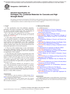 1.1 This specification covers the production, properties, packaging, and testing of packaged, dry, combined materials for concrete and high strength mortar. The classifications of concrete and mortar covered are defined in Section 3.