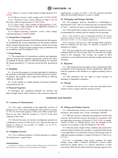 ASTM C387/C387M-23 is a technical specification published by ASTM International. Its full title is "Standard Specification for Packaged, Dry, Combined Materials for Concrete and High Strength Mortar". This standard covers: ABSTRACT This specification covers the production, properties, packaging, and testing of packaged, dry, combined materials for concrete and mortars. Concrete mixtures covered by this specification includes high-early strength concrete, normal strength concrete, normal weight concrete, high-strength mortar, and mortars for unit masonry. The purchaser shall specify the material desired as concrete, high strength mortar, or mortar for use with unit masonry, and the respective physical requirements. Materials used as ingredients in packaged, dry, combined materials for mortar and concrete shall be composed of aggregates, air-entraining admixtures, blended cement, chemical admixtures, fly ash, ground granulated blast-furnace slag, hydrated lime, latex and powder polymer modifiers, masonry cement, mortar cement, Portland cement, and silica fume. All aggregates shall be dried, without disintegration, to specific moisture content The proportions of cementitious material and aggregate shall be such that the strength requirements will be met. Packaged, dry, combined materials for concrete, high strength mortar and mortar for use with unit masonry shall conform to the respective compressive strength requirements. Scales conforming to the standards will be used for sampling concretes from a single batch using a sufficient quantity. A slump test will be performed to check if additional water is required. In sampling mortar, the contents of an entire package of dry, combined material for mortar for unit masonry or for concrete mortar shall be used. Mortar mixing equipment, which must be provided with a bowl positioning adapter, shall be used to ensure clearance for the largest size aggregate in the mix being tested. The specification includes the following testing methods for mortar: compressive strength, density and yield, air content, and water retention. SCOPE 1.1 This specification covers the production, properties, packaging, and testing of packaged, dry, combined materials for concrete and high strength mortar. The classifications of concrete and mortar covered are defined in Section 3. Note 1: The scope of this standard does not cover mortars for unit masonry. Dry preblended mortars for unit masonry are covered by Specification C1714/C1714M. 1.2 The values stated in either SI units or inch-pound units are to be regarded separately as standard. The values stated in each system may not be exact equivalents; therefore, each system shall be used independently of the other. Combining values from the two systems may result in non-conformance with the standard. Some values have only SI units because the inch-pound equivalents are not used in practice. 1.3 The text of this standard refers to notes and footnotes that provide explanatory material. These notes and footnotes (excluding those in tables and figures) shall not be considered as requirements of this standard. 1.4 The following safety hazards caveat pertains only to the test method portion of this specification. This standard does not purport to address all of the safety concerns, if any, associated with its use. It is the responsibility of the user of this standard to establish appropriate safety, health, and environmental practices and determine the applicability of regulatory limitations prior to use. 1.5 This international standard was developed in accordance with internationally recognized principles on standardization established in the Decision on Principles for the Development of International Standards, Guides and Recommendations issued by the World Trade Organization Technical Barriers to Trade (TBT) Committee.