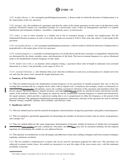 1.3 There are material-specific ASTM standards that cover the determination of resonance frequencies and elastic properties of specific materials by sonic resonance or by impulse excitation of vibration. Test Methods C215, C623, C747, C848, C1198, E1875, and E1876 may differ from this test method in several areas (for example, sample size, dimensional tolerances, sample preparation, calculation details, etc.). The testing of those materials should be done in compliance with the appropriate material-specific standards. Where possible, the pro...