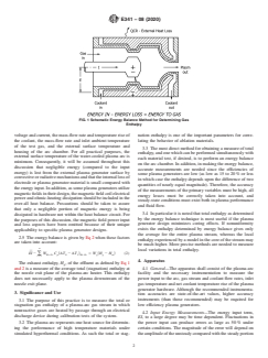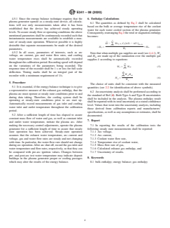 3.3 The most direct method for obtaining a measure of total enthalpy, and one which can be performed simultaneously with each material test, if desired, is to perform an energy balance on the arc chamber. In addition, in making the energy balance, accurate measurements are needed since the efficiencies of some plasma generators are low (as low as 15 to 20 % or less in which case the enthalpy depends upon the difference of two quantities of nearly equal magnitude). Therefore, the accuracy of the measurements of the primary variables must be high, all energy losses must be correctly taken into account, and steady-state conditions must exist both in plasma performance and fluid flow.