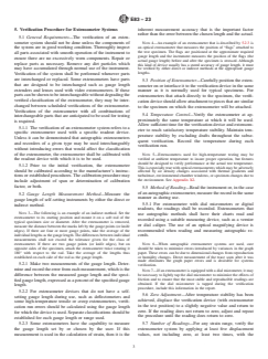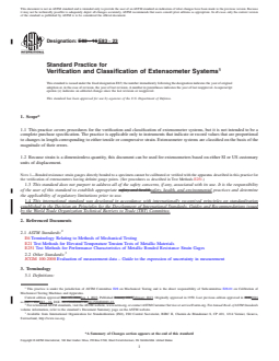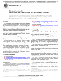 ABSTRACT This practice covers procedures for the verification and classification of extensometer systems, but it is not intended to be a complete purchase specification. The practice is applicable only to instruments that indicate or record values that are proportional to changes in length corresponding to either tensile or compressive strain. Extensometer systems are classified on the basis of the magnitude of their errors. The apparatus for verifying extensometer systems shall provide a means for applying controlled displacements to a simulated specimen and for measuring these displacements accurately. Extensometer systems shall be classified in accordance with the requirements as to maximum error of strain indicated: Class A; Class B-1; Class B-2; Class C; Class D; and Class E. Extensometer systems shall be categorized in three types according to gage length: Type 1; Type 2; and Type 3. A verification procedure for extensometer systems shall be done in accordance with the specified requirements. SCOPE 1.1 This practice covers procedures for the verification and classification of extensometer systems, but it is not intended to be a complete purchase specification. The practice is applicable only to instruments that indicate or record values that are proportional to changes in length corresponding to either tensile or compressive strain. Extensometer systems are classified on the basis of the magnitude of their errors. 1.2 Because strain is a dimensionless quantity, this document can be used for extensometers based on either SI or US customary units of displacement. Note 1: Bonded resistance strain gauges directly bonded to a specimen cannot be calibrated or verified with the apparatus described in this practice for the verification of extensometers having definite gauge points. (See procedures as described in Test Methods E251.) 1.3 This standard does not purport to address all of the safety concerns, if any, associated with its use. It is the responsibility of the user of this standard to establish appropriate safety, health, and environmental practices and determine the applicability of regulatory limitations prior to use. 1.4 This international standard was developed in accordance with internationally recognized principles on standardization established in the Decision on Principles for the Development of International Standards, Guides and Recommendations issued by the World Trade Organization Technical Barriers to Trade (TBT) Committee.