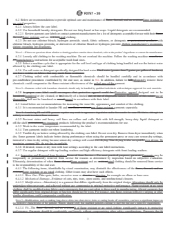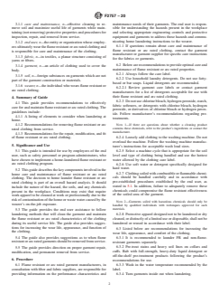 SIGNIFICANCE AND USE 5.1 This guide is intended for use by employees of the end user, such as safety personnel or program administrators, who have chosen to implement a home-laundered flame resistant or arc rated clothing program. 5.2 This guide describes the key components involved in the home care and maintenance of flame resistant or arc rated clothing. The decision to home launder flame resistant or arc rated clothing is part of an overall hazard analysis. It should include the nature of the hazard, the soils, and any chemicals present in the workplace. Conditions may exist that require work apparel to be cleaned at work or professionally due to the risk of contamination of the home or waste water caused by the wearer’s on-the-job exposure. 5.3 The guide provides the end user assistance to follow laundering methods that will clean the garment and maintain the flame resistant or arc rated characteristics of the clothing during its useful service life. The guide also provides suggestions for increasing the wear life, appearance, and function of the clothing. 5.4 The guide also provides suggestions as to when flame resistant or arc rated garments should be removed from service. 5.5 The guide provides direction on proper garment repair, modification, and permanent removal from service. SCOPE 1.1 This guide provides recommendations for home laundering of clothing that is flame resistant or arc rated. These recommendations address the home laundering process. Home laundering is an effective cleaning process for flame resistant or arc rated garments; follow all label care instructions. 1.1.1 This guide does not apply to industrial laundering of flame resistant or arc rated clothing. For more information on industrial laundering, follow Guide F1449 or contact your garment supplier. 1.1.2 This guide does not apply to dry cleaning of flame resistant or arc rated clothing. For more information on dry cleaning, follow label instructions or contact your garment supplier or fabric manufacturer. Dry cleaning indicates cleaning by a professional dry cleaner. 1.2 The National Institute for Occupational Safety and Health (NIOSH) recommends leaving clothing soiled with hazardous chemicals at work to be laundered by the employer or, if such clothing is washed at home, to launder separately from the family wash. 1.3 It is important that potentially flammable contaminants are removed from garments during the wash process. If flammable contaminants are not removed, the flame resistance of the garment may be compromised. Effective cleaning and proper maintenance of the protective characteristics of flame resistant or arc rated clothing should include consideration of cleaning, repair, and replacement. 1.3.1 To reduce the potential of employees wearing garments contaminated with flammable substances, the end user should analyze the soil conditions to which a wearer may be exposed, along with the effectiveness of the wash procedure. If it is deemed ineffective, effective solutions should be pursued (dry cleaning, industrial laundry, surfactants, disposable FR coveralls, etc.). 1.4 It is important that the processes and materials used to launder flame resistant garments are compatible with the FR materials to ensure that the FR protection of the garment is not compromised during the laundering process. 1.5 It is the responsibility of the end user to determine if their laundering method is the appropriate care and maintenance procedure for their application. (See Appendix X1 and X1.1.) 1.6 This guide does not apply to specialized protective garments such as specialized firefighter turnout gear and proximity firefighter ensembles. 1.7 This guide also provides recommendations for inspection criteria that are significant to the performance of flame resistant or arc rated clothing. 1.8 This standard does not purport to address all of the safety concerns, if any, associated with its use. It is the r...