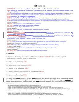 ASTM E3370-23 is a standard published by ASTM International. Its full title is "Standard Practice for Matrix Array Ultrasonic Testing of Composites, Sandwich Core Constructions, and Metals". This standard covers: SIGNIFICANCE AND USE 5.1 The procedures described in this practice have proven utility in the inspecting (1) monolithic polymer matrix composites (laminates) for bulk defects, (2) metals for corrosion during the service life of the part of interest, (3) thickness checks, (4) adhesive bonding of metals, composites, and sandwich core constructions, (5) coatings, and (6) composite filament windings. Both unpressurized, and with suitable precautions, pressurized materials and components are inspected. 5.2 This practice provides guidelines for the application of longitudinal wave examination to the detection and quantitative evaluation of damage, discontinuities, and thickness variations in materials. 5.3 This practice is intended primarily for the testing of parts to acceptance criteria most typically specified in a purchase order or other contractual document, and for testing of parts in-service to detect and evaluate damage. 5.4 MAUT search units provide near-surface resolution and detection of small discontinuities comparable to phased array transducers. They may or may not be capable of beam steering. The advantage of MAUT for straight-beam longitudinal wave inspections is the ability to provide real-time C-scan data, which facilitates data interpretation and shortens inspection time. Depending on inspection needs, data can be displayed as A-, B- or C-scans, or three-dimensional renderings. Toggling between pulse-echo and through transmission ultrasonic (TTU) modes without having to use another system or changing transducers is also possible. 5.5 The MAUT technique has proven utility in the inspection of multi-ply carbon-fiber reinforced laminates used in primary aircraft structures.11 5.6 For ultrasonic testing of laminate composites and sandwich core materials using conventional UT equipment consult Practice E2580. Consult Practice E114 for ultrasonic testing of materials by the pulse-echo method using straightbeam longitudinal waves introduced by a piezoelectric elemen... SCOPE 1.1 This practice covers procedures for matrix array ultrasonic testing (MAUT) of monolithic composites, composite sandwich constructions, and metallic test articles. These procedures can be used throughout the life cycle of a part during product and process design optimization, on line process control, post-manufacturing inspection, and in-service inspection. 1.2 In general, ultrasonic testing is a common volumetric method for detection of embedded or subsurface discontinuities. This practice includes general requirements and procedures which may be used for detecting flaws and for making a relative or approximate evaluation of the size of discontinuities and part anomalies. The types of flaws or discontinuities detected include interply delaminations, foreign object debris (FOD), inclusions, disbond/un-bond, fiber debonding, fiber fracture, porosity, voids, impact damage, thickness variation, and corrosion. 1.3 Typical test articles include monolithic composite layups such as uniaxial, cross ply and angle ply laminates, sandwich constructions, bonded structures, and filament windings, as well as forged, wrought and cast metallic parts. Two techniques can be considered based on accessibility of the inspection surface: namely, pulse echo inspection for one-sided access and through-transmission for two-sided access. As used in this practice, both require the use of a pulsed straight-beam ultrasonic longitudinal wave followed by observing indications of either the reflected (pulse-echo) or received (through transmission) wave. 1.4 This practice provides two ultrasonic test procedures. Each has its own merits and requirements for inspection and shall be selected as agreed upon in a contractual document. 1.4.1 Test Procedure A, Pulse Echo (non-contacting and contacting) is at a minimum a single matrix array transducer transmitting and receiving longitudinal waves in the range of 0.5 MHz to 20 MHz (see Fig. 1). Th...