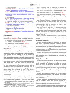 SIGNIFICANCE AND USE 5.1 The procedures described in this practice have proven utility in the inspecting (1) monolithic polymer matrix composites (laminates) for bulk defects, (2) metals for corrosion during the service life of the part of interest, (3) thickness checks, (4) adhesive bonding of metals, composites, and sandwich core constructions, (5) coatings, and (6) composite filament windings. Both unpressurized, and with suitable precautions, pressurized materials and components are inspected. 5.2 This practice provides guidelines for the application of longitudinal wave examination to the detection and quantitative evaluation of damage, discontinuities, and thickness variations in materials. 5.3 This practice is intended primarily for the testing of parts to acceptance criteria most typically specified in a purchase order or other contractual document, and for testing of parts in-service to detect and evaluate damage. 5.4 MAUT search units provide near-surface resolution and detection of small discontinuities comparable to phased array transducers. They may or may not be capable of beam steering. The advantage of MAUT for straight-beam longitudinal wave inspections is the ability to provide real-time C-scan data, which facilitates data interpretation and shortens inspection time. Depending on inspection needs, data can be displayed as A-, B- or C-scans, or three-dimensional renderings. Toggling between pulse-echo and through transmission ultrasonic (TTU) modes without having to use another system or changing transducers is also possible. 5.5 The MAUT technique has proven utility in the inspection of multi-ply carbon-fiber reinforced laminates used in primary aircraft structures.11 5.6 For ultrasonic testing of laminate composites and sandwich core materials using conventional UT equipment consult Practice E2580. Consult Practice E114 for ultrasonic testing of materials by the pulse-echo method using straightbeam longitudinal waves introduced by a piezoelectric elemen... SCOPE 1.1 This practice covers procedures for matrix array ultrasonic testing (MAUT) of monolithic composites, composite sandwich constructions, and metallic test articles. These procedures can be used throughout the life cycle of a part during product and process design optimization, on line process control, post-manufacturing inspection, and in-service inspection. 1.2 In general, ultrasonic testing is a common volumetric method for detection of embedded or subsurface discontinuities. This practice includes general requirements and procedures which may be used for detecting flaws and for making a relative or approximate evaluation of the size of discontinuities and part anomalies. The types of flaws or discontinuities detected include interply delaminations, foreign object debris (FOD), inclusions, disbond/un-bond, fiber debonding, fiber fracture, porosity, voids, impact damage, thickness variation, and corrosion. 1.3 Typical test articles include monolithic composite layups such as uniaxial, cross ply and angle ply laminates, sandwich constructions, bonded structures, and filament windings, as well as forged, wrought and cast metallic parts. Two techniques can be considered based on accessibility of the inspection surface: namely, pulse echo inspection for one-sided access and through-transmission for two-sided access. As used in this practice, both require the use of a pulsed straight-beam ultrasonic longitudinal wave followed by observing indications of either the reflected (pulse-echo) or received (through transmission) wave. 1.4 This practice provides two ultrasonic test procedures. Each has its own merits and requirements for inspection and shall be selected as agreed upon in a contractual document. 1.4.1 Test Procedure A, Pulse Echo (non-contacting and contacting) is at a minimum a single matrix array transducer transmitting and receiving longitudinal waves in the range of 0.5 MHz to 20 MHz (see Fig. 1). Th...