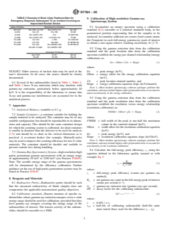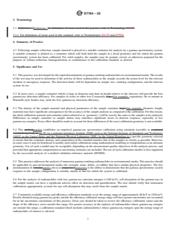 SIGNIFICANCE AND USE 5.1 This practice was developed for the rapid determination of gamma-emitting radionuclides in environmental media. The results of the test may be used to determine if the activity of these radionuclides in the sample exceeds the action level for the relevant incident or emergency response. The detection limits will be dependent on sample size, counting configuration, and the detector system in use. 5.2 In most cases, a sample container which is large in diameter and short in height relative to the detector will provide the best gamma-ray detection efficiency. For samples of water or other low-Z materials (for example, vegetation), the re-entrant or Marinelli-style beaker may yield the best gamma-ray detection efficiency. 5.3 The density of the sample material and physical parameters of the sample container (for example, diameter, height, material) may have significant consequences for the accuracy of the sample analysis as compared to the calibration. For this reason, the ideal calibration material and container (often referred to as ‘geometry’) will be exactly the same as the samples to be analyzed. Differences in sample container or sample matrix may introduce significant errors in detector response, especially at low gamma-ray energies. Every effort should be made to account for these differences if the exact calibration geometry is not available. 5.4 This practice establishes an empirical gamma-ray spectrometer calibration using standards traceable to the SI via a national metrology institute (NMI) such as the National Institute of Standards and Technology (NIST) in the United States and the National Physical Laboratory (NPL) in the United Kingdom in a specific geometry selected to ensure that the container, density, and composition of the standard matches that of the samples as closely as possible. However, in some cases it may be beneficial to modify such initial calibrations using mathematical modeling or extrapolations to an alternate geometry. Use... SCOPE 1.1 This practice covers the quantification of radionuclides in environmental media (for example, water, soil, vegetation, food) by means of simple preparation and counting with a high-resolution gamma ray detector. Because the practice is designed for rapid analysis, extensive efforts to ensure homogeneity or ideal sample counting conditions are not taken. 1.2 The values stated in SI units are to be regarded as standard. The values given in parentheses after SI units are provided for information only and are not considered standard. 1.3 This standard does not purport to address all of the safety concerns, if any, associated with its use. It is the responsibility of the user of this standard to establish appropriate safety, health, and environmental practices and determine the applicability of regulatory limitations prior to use. 1.4 This international standard was developed in accordance with internationally recognized principles on standardization established in the Decision on Principles for the Development of International Standards, Guides and Recommendations issued by the World Trade Organization Technical Barriers to Trade (TBT) Committee.