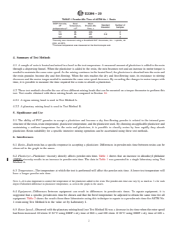 5.1 The ability of PVC granules to accept a plasticizer and become a dry free-flowing powder is related to the internal pore structure of the resin, resin temperature, plasticizer temperature, and the plasticizer used. By choosing an applicable plasticizer and maintaining a uniform temperature for the resin and plasticizer, it is possible to classify resins by how rapidly they absorb plasticizer. Resin suitability for a specific intensive mixing operation can be ascertained using these test methods.