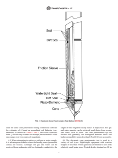 SIGNIFICANCE AND USE 4.1 Environmental site characterization projects almost always require information regarding subsurface soil stratigraphy and hydraulic parameters related to groundwater flow rate and direction. Soil stratigraphy often is determined by various drilling procedures and interpreting the data collected on borehole logs. The electronic piezocone penetrometer test is another means of determining soil stratigraphy that may be faster, less expensive, and provide greater resolution of the soil units than conventional drilling and sampling methods. For environmental site characterization applications, the electronic piezocone also has the additional advantage of not generating contaminated cuttings that may present other disposal problems (2, 3, 4, 5, 6, 7, 8, 9, 10). Investigators may obtain soil samples from adjacent borings for correlation purposes, but prior information or experience in the same area may preclude the need for borings (11). Most cone penetrometer rigs are equipped with direct push soil samplers (Guide D6282/D6282M) that can be used to confirm soil types. 4.2 The electronic piezocone penetration test is an in situ investigation method involving: 4.2.1 Pushing an electronically instrumented probe into the ground (see Fig. 1 for a diagram of a typical cone penetrometer). The position of the pore pressure element may vary but is typically located in the u2 position, as shown in Fig. 1 (Test Method D5778). 4.2.3.3 Robertson proposed the following equations estimating k from Ic and shown on Fig. 4 (11). These equations are used for some cone penetration testing commercial software for estimates of k based on normalized soil behavior type. However, as shown on Tables 1 and 2, the values estimated from Ic are not very accurate for example, the estimated k value may range over two orders of magnitude. FIG. 4 Proposed Relationship Between Ic and Normalized Soil Behavior Type and Estimated Soil Permeability, k (Robertson (1)) 4.3 When attempting to re... SCOPE 1.1 The electronic cone penetrometer test often is used to determine subsurface stratigraphy for geotechnical and environmental site characterization purposes (1).2 The geotechnical application of the electronic cone penetrometer test is discussed in detail in Test Method D5778, however, the use of the electronic cone penetrometer test in environmental site characterization applications involves further considerations that are not discussed. For environmental site characterization, it is highly recommended to use the Piezocone (PCPT or CPTu) option in Test Method D5778 so information on hydraulic conductivity and aquifer hydrostatic pressures can be evaluated. 1.2 The purpose of this practice is to discuss aspects of the electronic cone penetrometer test that need to be considered when performing tests for environmental site characterization purposes. 1.3 The electronic cone penetrometer test for environmental site characterization projects often requires steam cleaning the push rods and grouting the hole. There are numerous ways of cleaning and grouting depending on the scope of the project, local regulations, and corporate preferences. It is beyond the scope of this practice to discuss all of these methods in detail. A detailed explanation of grouting procedures is discussed in Guide D6001. 1.4 Cone penetrometer tests are often used to locate aquifer zones for installation of wells (Practice D5092/D5092M, Guide D6274). The cone test may be combined with direct push soil sampling for confirming soil types (Guide D6282/D6282M). Direct push hydraulic injection profiling (Practice D8037/D8037M) is another complementary test for estimating hydraulic conductivity and direct push slug tests (D7242/D7242M) and used for confirming estimates. Cone penetrometers can be equipped with additional sensors for groundwater quality evaluations (Practice D6187). Location of other sensors must conform to requirements of Test Meth...