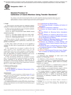 ASTM D5011-17 is a standard published by ASTM International. Its full title is "Standard Practices for Calibration of Ozone Monitors Using Transfer Standards". This standard covers: SIGNIFICANCE AND USE 5.1 The reactivity and instability of O3 precludes the storage of O3 concentration standards for any practical length of time, and precludes direct certification of O3 concentrations as SRM's. Moreover, there is no available SRM that can be readily and directly adapted to the generation of O3 standards analogous to permeation devices and standard gas cylinders for sulfur dioxide and nitrogen oxides. Dynamic generation of O3 concentrations is relatively easy with a source of ultraviolet (UV) radiation. However, accurately certifying an O3 concentration as a primary standard requires assay of the concentration by a comprehensively specified analytical procedure, which must be performed every time a standard is needed. 5.2 The primary UV standard photometers, which are usually used at a fixed location under controlled conditions, are used to certify transfer standards that are then transported to the field sites where the ambient ozone monitors are being used. See Practice D5110. 5.3 The advantages of this procedure are: 5.3.1 All O3 monitors in a given network or region may be traced to a single primary standard. 5.3.2 The primary standard is used at only one location, under controlled conditions. 5.3.3 Transfer standards are more rugged and more easily portable than primary standards. 5.3.4 Transfer standards may be used to intercompare various primary standards. SCOPE 1.1 These practices describe means for calibrating ambient, workplace or indoor ozone monitors, using transfer standards. 1.2 These practices describe five types of transfer standards: Practice A—Analytical instruments, Practice B—Boric acid potassium iodide (BAKI) manual analytical procedure, Practice C—Gas phase titration with excess nitric oxide, Practice D—Gas phase titration with excess ozone, and Practice E—Ozone generator device. 1.3 These practices describe procedures to establish the authority of transfer standards: qualification, certification, and periodic recertification. 1.4 The values stated in SI units are to be regarded as standard. No other units of measurement are included in this standard. 1.5 This standard does not purport to address all of the safety concerns, if any, associated with its use. It is the responsibility of the user of this standard to establish appropriate safety, health, and environmental practices and determine the applicability of regulatory limitations prior to use. See Section 8 for specific precautionary statements. 1.6 This international standard was developed in accordance with internationally recognized principles on standardization established in the Decision on Principles for the Development of International Standards, Guides and Recommendations issued by the World Trade Organization Technical Barriers to Trade (TBT) Committee.