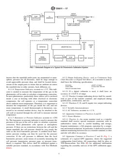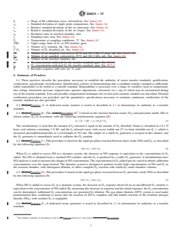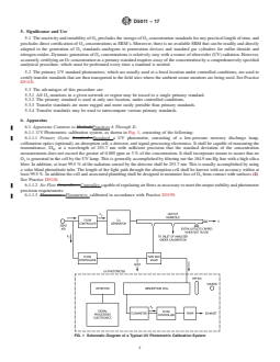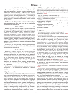 SIGNIFICANCE AND USE 5.1 The reactivity and instability of O3 precludes the storage of O3 concentration standards for any practical length of time, and precludes direct certification of O3 concentrations as SRM's. Moreover, there is no available SRM that can be readily and directly adapted to the generation of O3 standards analogous to permeation devices and standard gas cylinders for sulfur dioxide and nitrogen oxides. Dynamic generation of O3 concentrations is relatively easy with a source of ultraviolet (UV) radiation. However, accurately certifying an O3 concentration as a primary standard requires assay of the concentration by a comprehensively specified analytical procedure, which must be performed every time a standard is needed. 5.2 The primary UV standard photometers, which are usually used at a fixed location under controlled conditions, are used to certify transfer standards that are then transported to the field sites where the ambient ozone monitors are being used. See Practice D5110. 5.3 The advantages of this procedure are: 5.3.1 All O3 monitors in a given network or region may be traced to a single primary standard. 5.3.2 The primary standard is used at only one location, under controlled conditions. 5.3.3 Transfer standards are more rugged and more easily portable than primary standards. 5.3.4 Transfer standards may be used to intercompare various primary standards. SCOPE 1.1 These practices describe means for calibrating ambient, workplace or indoor ozone monitors, using transfer standards. 1.2 These practices describe five types of transfer standards: Practice A—Analytical instruments, Practice B—Boric acid potassium iodide (BAKI) manual analytical procedure, Practice C—Gas phase titration with excess nitric oxide, Practice D—Gas phase titration with excess ozone, and Practice E—Ozone generator device. 1.3 These practices describe procedures to establish the authority of transfer standards: qualification, certification, and periodic recertification. 1.4 The values stated in SI units are to be regarded as standard. No other units of measurement are included in this standard. 1.5 This standard does not purport to address all of the safety concerns, if any, associated with its use. It is the responsibility of the user of this standard to establish appropriate safety, health, and environmental practices and determine the applicability of regulatory limitations prior to use. See Section 8 for specific precautionary statements. 1.6 This international standard was developed in accordance with internationally recognized principles on standardization established in the Decision on Principles for the Development of International Standards, Guides and Recommendations issued by the World Trade Organization Technical Barriers to Trade (TBT) Committee.