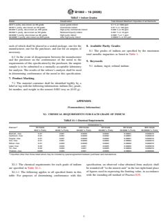 ABSTRACT This specification covers requirements for refined indium as ingot in six grades, namely: Grade 99.9 or 3N grade (indium with a purity of 99.90%); Grade 99.99 or 4N grade (indium with a purity of 99.99%); Grade 99.995 or 4N5 grade (indium with a purity of 99.995%); Grade 99.999 or 5N grade (indium with a purity of 99.999%); Grade 99.9999 or 6N grade (indium with a purity of 99.9999%); and Grade 99.99995 or 6N5 grade (indium with a purity of 99.99995%). Indium metal from ingot can be fabricated into shot, spheres, wire, sheet, foil, tubing, and other customized fabrications with purities up to and including Grade 99.999. Grades 99.9999 and 99.99995 are available in ingot form only. This specification specifies the requirements for the manufacturing process; sampling; product marking; and maximum total metallic impurities for indium grades. SCOPE 1.1 This specification covers refined indium as ingot in six grades as follows: 1.1.1 Grade 99.9—Indium having a purity of 99.90 %, also known as 3N grade, 1.1.2 Grade 99.99—Indium having a purity of 99.99 %, also known as 4N grade, 1.1.3 Grade 99.995—Indium having a purity of 99.995 %, also known as 4N5 grade, 1.1.4 Grade 99.999—Indium having a purity of 99.999 %, also known as 5N grade, 1.1.5 Grade 99.9999—Indium having a purity of 99.9999 %, also known as 6N grade, and 1.1.6 Grade 99.99995—Indium having a purity of 99.99995 %, also known as 6N5 grade. 1.2 Indium metal from ingot can be fabricated into shot, spheres, wire, sheet, foil, tubing, and other customized fabrications with purities up to and including Grade 99.999. Grades 99.9999 and 99.99995 are available in ingot form only. 1.3 The values stated in inch-pound units are to be regarded as standard. The values given in parentheses are mathematical conversions to SI units that are provided for information only and are not considered standard. 1.4 This standard does not purport to address all of the safety concerns, if any, associated with its use. It is the responsibility of the user of this standard to become familiar with all hazards including those identified in the appropriate Safety Data Sheet (SDS) for this product/material as provided by the manufacturer, to establish appropriate safety, health, and environmental practices, and determine the applicability of regulatory limitations prior to use. 1.5 This international standard was developed in accordance with internationally recognized principles on standardization established in the Decision on Principles for the Development of International Standards, Guides and Recommendations issued by the World Trade Organization Technical Barriers to Trade (TBT) Committee.