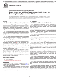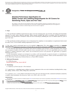 SCOPE 1.1 This specification establishes requirements for safety covers for swimming pools, spas, hot tubs, and wading pools (hereinafter referred to as pools, unless otherwise specified). When correctly installed and used in accordance with the manufacturer's instructions, this specification is intended to reduce the risk of drowning by inhibiting the access of children under five years of age to the water. 1.2 This specification includes performance tests to demonstrate the compliance or noncompliance to requirements herein stated for safety covers. It also includes marking requirements for all covers. 1.3 The values stated in inch-pound units are to be regarded as standard. The values given in parentheses are mathematical conversions to SI units that are provided for information only and are not considered standard. 1.4 The following safety hazards caveat pertains only to the test methods section, Section 9, of this specification: This standard does not purport to address all of the safety concerns, if any, associated with its use. It is the responsibility of the user of this standard to establish appropriate safety, health, and environmental practices and determine the applicability of regulatory limitations prior to use. 1.5 This international standard was developed in accordance with internationally recognized principles on standardization established in the Decision on Principles for the Development of International Standards, Guides and Recommendations issued by the World Trade Organization Technical Barriers to Trade (TBT) Committee.