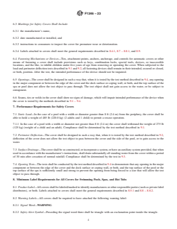 ASTM F1346-23 is a technical specification published by ASTM International. Its full title is "Standard Performance Specification for Safety Covers and Labeling Requirements for All Covers for Swimming Pools, Spas and Hot Tubs". This standard covers: SCOPE 1.1 This specification establishes requirements for safety covers for swimming pools, spas, hot tubs, and wading pools (hereinafter referred to as pools, unless otherwise specified). When correctly installed and used in accordance with the manufacturer's instructions, this specification is intended to reduce the risk of drowning by inhibiting the access of children under five years of age to the water. 1.2 This specification includes performance tests to demonstrate the compliance or noncompliance to requirements herein stated for safety covers. It also includes marking requirements for all covers. 1.3 The values stated in inch-pound units are to be regarded as standard. The values given in parentheses are mathematical conversions to SI units that are provided for information only and are not considered standard. 1.4 The following safety hazards caveat pertains only to the test methods section, Section 9, of this specification: This standard does not purport to address all of the safety concerns, if any, associated with its use. It is the responsibility of the user of this standard to establish appropriate safety, health, and environmental practices and determine the applicability of regulatory limitations prior to use. 1.5 This international standard was developed in accordance with internationally recognized principles on standardization established in the Decision on Principles for the Development of International Standards, Guides and Recommendations issued by the World Trade Organization Technical Barriers to Trade (TBT) Committee.