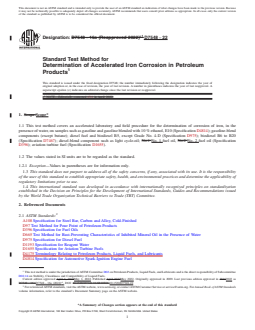 SIGNIFICANCE AND USE 5.1 In general, wherever the possibility exists of water getting mixed with products/material (covered under 1.1) the results obtained by this test method will indicate the degree to which corrosion of iron components can be expected. 5.2 Test also determines the antirust properties of products/material (covered under 1.1) in preparation for the various stages through which the tested product may pass prior to or during its transport through a pipeline. 5.3 Test results are also meant to show whether or not the dosage levels and type of iron corrosion inhibitor added to a product/material (covered under 1.1) is sufficient for achieving the desired protection of affected assets such as storage tanks, process lines, and shipment systems. SCOPE 1.1 This test method covers an accelerated laboratory and field procedure for the determination of corrosion of iron, in the presence of water, on samples such as gasoline and gasoline blended with 10 % ethanol, E10 (Specification D4814); gasoline-blend components (except butane); diesel fuel and biodiesel B5, except Grade No. 4-D (Specification D975); biodiesel B6 to B20 (Specification D7467); diesel-blend component such as light cycle-oil; No. 1 fuel oil, No. 2 fuel oil (Specification D396); aviation turbine fuel (Specification D1655). 1.2 The values stated in SI units are to be regarded as the standard. 1.2.1 Exception—Values in parentheses are for information only. 1.3 This standard does not purport to address all of the safety concerns, if any, associated with its use. It is the responsibility of the user of this standard to establish appropriate safety, health, and environmental practices and determine the applicability of regulatory limitations prior to use. 1.4 This international standard was developed in accordance with internationally recognized principles on standardization established in the Decision on Principles for the Development of International Standards, Guides and Recommendations issued by the World Trade Organization Technical Barriers to Trade (TBT) Committee.