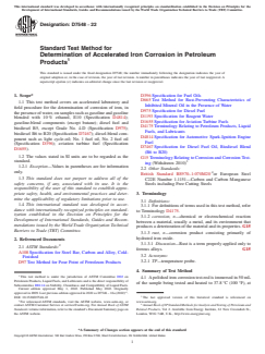 ASTM D7548-22 is a standard published by ASTM International. Its full title is "Standard Test Method for Determination of Accelerated Iron Corrosion in Petroleum Products". This standard covers: SIGNIFICANCE AND USE 5.1 In general, wherever the possibility exists of water getting mixed with products/material (covered under 1.1) the results obtained by this test method will indicate the degree to which corrosion of iron components can be expected. 5.2 Test also determines the antirust properties of products/material (covered under 1.1) in preparation for the various stages through which the tested product may pass prior to or during its transport through a pipeline. 5.3 Test results are also meant to show whether or not the dosage levels and type of iron corrosion inhibitor added to a product/material (covered under 1.1) is sufficient for achieving the desired protection of affected assets such as storage tanks, process lines, and shipment systems. SCOPE 1.1 This test method covers an accelerated laboratory and field procedure for the determination of corrosion of iron, in the presence of water, on samples such as gasoline and gasoline blended with 10 % ethanol, E10 (Specification D4814); gasoline-blend components (except butane); diesel fuel and biodiesel B5, except Grade No. 4-D (Specification D975); biodiesel B6 to B20 (Specification D7467); diesel-blend component such as light cycle-oil; No. 1 fuel oil, No. 2 fuel oil (Specification D396); aviation turbine fuel (Specification D1655). 1.2 The values stated in SI units are to be regarded as the standard. 1.2.1 Exception—Values in parentheses are for information only. 1.3 This standard does not purport to address all of the safety concerns, if any, associated with its use. It is the responsibility of the user of this standard to establish appropriate safety, health, and environmental practices and determine the applicability of regulatory limitations prior to use. 1.4 This international standard was developed in accordance with internationally recognized principles on standardization established in the Decision on Principles for the Development of International Standards, Guides and Recommendations issued by the World Trade Organization Technical Barriers to Trade (TBT) Committee.