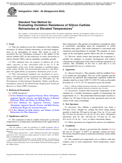 ASTM C863-00(2022), titled "Standard Test Method for Evaluating Oxidation Resistance of Silicon Carbide Refractories at Elevated Temperatures," provides a methodology for assessing the oxidation resistance of silicon carbide (SiC) refractory products. The standard is developed by ASTM International and is crucial for understanding the long-term performance of SiC refractories in high-temperature environments where oxidation can cause degradation. This standard ensures international alignment by following principles established by the World Trade Organization Technical Barriers to Trade (TBT) Committee.