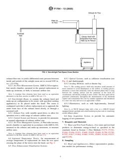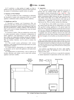 SIGNIFICANCE AND USE 5.1 Threshold of Capture and Containment—This test method describes flow visualization techniques that are used to determine the threshold of capture and containment (C&C) for idle and specified heavy cooking conditions. The threshold of C&C can be used to estimate minimum flow rates for hood/appliance systems. 5.2 Parametric Studies—This test method also can be used to conduct parametric studies of alternative configurations of hoods, appliances, and replacement air systems. In general, these studies are conducted by holding constant all configuration and operational variables except the variable of interest. This test method, therefore, can be used to evaluate the following: 5.2.1 The overall system performance with various appliances, while holding the hood and replacement air system characteristics constant. 5.2.2 Entire hoods or characteristics of a single hood, such as end panels, can be varied with appliances and replacement air constant. 5.2.3 Replacement air characteristics, such as make-up air location, direction, and volume, can be varied with constant appliance and hood variables. SCOPE 1.1 Characterization of capture and containment performance of hood, appliance(s), and replacement air system during cooking and non-cooking conditions (idle): 1.2 Parametric evaluation of operational or design variations in appliances, hoods, or replacement air configurations. 1.3 The test method to determine heat gain to space from commercial kitchen ventilation/appliance systems has been re-designated as Test Method F2474. 1.4 The values stated in inch-pound units are to be regarded as standard. No other units of measurement are included in this standard. 1.5 This standard does not purport to address all of the safety concerns, if any, associated with its use. It is the responsibility of the user of this standard to establish appropriate safety, health, and environmental practices and determine the applicability of regulatory limitations prior to use. 1.6 This international standard was developed in accordance with internationally recognized principles on standardization established in the Decision on Principles for the Development of International Standards, Guides and Recommendations issued by the World Trade Organization Technical Barriers to Trade (TBT) Committee.