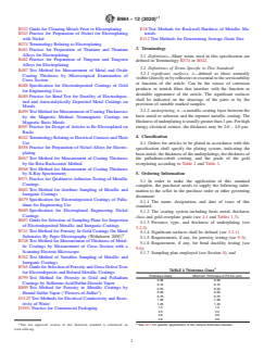 ASTM B984-12(2020)e1 is a technical specification published by ASTM International. Its full title is "Standard Specification for Electrodeposited Coatings of Palladium-Cobalt Alloy for Engineering Use". This standard covers: ABSTRACT This specification covers requirements for electrodeposited palladium-cobalt alloy coatings containing approximately 80% of palladium and 20% of cobalt. It also covers composite coatings consisting of palladium-cobalt with a thin gold overplate for applications involving electrical contacts. Palladium and palladium-cobalt remain competitive finishes for high reliability applications. The specification deals with material classification, ordering information, materials and manufacture, coating requirements, sampling, test methods, special government requirements, and other requirements. SCOPE 1.1 This specification covers requirements for electrodeposited palladium-cobalt alloy coatings containing approximately 80 % of palladium and 20 % of cobalt. Composite coatings consisting of palladium-cobalt with a thin gold overplate for applications involving electrical contacts are also covered. Palladium and palladium-cobalt remain competitive finishes for high reliability applications. 1.2 Properties—Palladium is the lightest and least noble of the platinum group metals (1)2. It has the density of 12 gm per cubic centimeter, specific gravity of 12.0, that is substantially lower than the density of gold, 19.29 gm per cubic centimeter, specific gravity 19.3, and platinum 21.48 gm per cubic centimeter, specific gravity 21.5. The density of cobalt on the other hand is even less than palladium. It is only 8.69 gm per cubic centimeter, specific gravity 8.7. This yields a greater volume or thickness of coating and, consequently, some saving of metal weight and reduced cost. Palladium-cobalt coated surfaces provide a hard surface finish (Test Methods E18), thus decreasing wear and increasing durability. Palladium-cobalt coated surfaces also have a very low coefficient of friction 0.43 compared to hard gold 0.60, thus providing lower mating and unmating forces for electrical contacts (1). Palladium-cobalt has smaller grain size (Test Methods E112), 50 – 150 Angstroms, compared to Hard Gold 200 – 250 Angstroms (1), or 5 – 15 nanometer, compared to hard gold 20 – 25 nanometer (1). Palladium-cobalt has low porosity (Test Method B799) 0.2 porosity index compared to hard gold 3.7 porosity index (1). Palladium-cobalt coated surfaces have high ductility (Practice B489) 3-7 % compared to that of hard gold 1). The palladium-cobalt coated surface is also thermally more stable 395 °C than hard gold 150 °C, and silver 170 °C. The following Table 1 compares the hardness range of electrodeposited palladium-cobalt with other electrodeposited noble metals and alloys (2, 3). 1.3 Units—The values stated in SI units are to be regarded as standard. No other units of measurement are included in this standard. 1.4 This standard does not purport to address all of the safety concerns, if any, associated with its use. It is the responsibility of the user of this standard to establish appropriate safety, health, and environmental practices and determine the applicability of regulatory limitations prior to use. 1.5 This international standard was developed in accordance with internationally recognized principles on standardization established in the Decision on Principles for the Development of International Standards, Guides and Recommendations issued by the World Trade Organization Technical Barriers to Trade (TBT) Committee.
