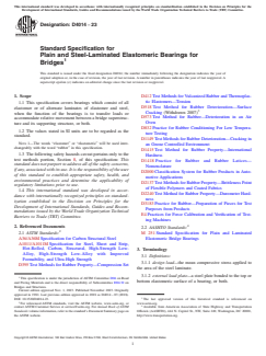 ASTM D4014-23 - Standard Specification for Plain and Steel-Laminated Elastomeric Bearings for Bridges defines requirements for elastomeric bearings utilized in bridge construction. These bearings, constructed from either all-elastomer or a combination of elastomer and steel laminates, are essential for transferring loads and accommodating movements between a bridge’s superstructure and its supporting structure. The standard, published by ASTM International, establishes criteria ensuring that these bearings perform reliably under varied environmental and structural conditions.