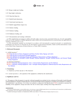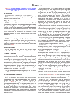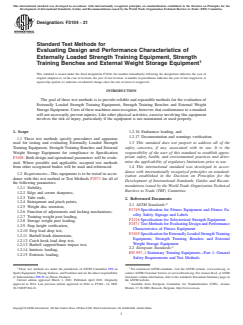SIGNIFICANCE AND USE 4.1 The purpose of this document is to provide valid and repeatable test methods for the evaluation of Externally Loaded Strength Training Equipment, Strength Training Benches and External Weight Storage Equipment assembled and maintained according to the manufacturer's specifications. Use of these test methods in conjunction with Specification F3105 is intended to maximize the reliability of the equipment’s design and reduce the risk of serious injury resulting from design deficiencies. SCOPE 1.1 These test methods specify procedures and apparatus used for testing and evaluating Externally Loaded Strength Training Equipment, Strength Training Benches and External Weight Storage Equipment for compliance to Specification F3105. Both design and operational parameters will be evaluated. Where possible and applicable, accepted test methods from other recognized bodies will be used and referenced. 1.2 Requirements—This equipment is to be tested in accordance with this test method or Test Methods F2571 for all of the following parameters: 1.2.1 Stability, 1.2.2 Edge and corner sharpness, 1.2.3 Tube ends, 1.2.4 Entrapment and pinch points, 1.2.5 Weight disc retention, 1.2.6 Function of adjustments and locking mechanisms, 1.2.7 Training weight post loading, 1.2.8 Storage weight post loading, 1.2.9 Stop height verification, 1.2.10 Stop load drop test, 1.2.11 Barbell hook dimensions, 1.2.12 Catch hook load drop test, 1.2.13 Barbell support/frame impact test, 1.2.14 Intrinsic loading, 1.2.15 Extrinsic loading, 1.2.16 Endurance loading, and 1.2.17 Documentation and warnings verification. 1.3 This standard does not purport to address all of the safety concerns, if any, associated with its use. It is the responsibility of the user of this standard to establish appropriate safety, health, and environmental practices and determine the applicability of regulatory limitations prior to use. 1.4 This international standard was developed in accordance with internationally recognized principles on standardization established in the Decision on Principles for the Development of International Standards, Guides and Recommendations issued by the World Trade Organization Technical Barriers to Trade (TBT) Committee.