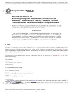 1.1 These test methods specify procedures and apparatus used for testing and evaluating Externally Loaded Strength Training Equipment, Strength Training Benches and External Weight Storage Equipment for compliance to Specification F3105. Both design and operational parameters will be evaluated. Where possible and applicable, accepted test methods from other recognized bodies will be used and referenced.