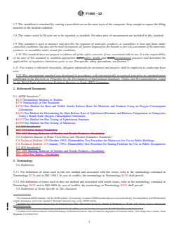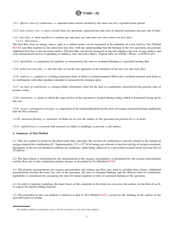 ASTM F1550-22 is a standard published by ASTM International. Its full title is "Standard Test Method for Determination of Fire-Test-Response Characteristics of Components or Composites of Mattresses or Furniture for Use in Correctional Facilities after Exposure to Vandalism, by Employing a Bench Scale Oxygen Consumption Calorimeter". This standard covers: SIGNIFICANCE AND USE 5.1 This test method provides a means to determine various fire-test-response characteristics, including the time to sustained flaming and the heat release rate, of composites exposed to a prescribed initial test heat flux in the cone calorimeter apparatus, after they have been vandalized in a prescribed manner, to expose the filling material. 5.2 It is clearly impossible to predict the manner in which a mattress or furniture will be vandalized. The objective of this test method is to develop data indicating the effect of violating the integrity of the fabric (or the fabric plus interliner composite) protection and exposing the padding to the source of heat (see Appendix X3). 5.3 Quantitative heat release measurements provide information which is useful for product design and product development, for mattresses or furniture destined for correctional occupancies. 5.4 Heat release measurements provide useful information for product development by giving a quantitative measure of specific changes in fire performance caused by component and composite modifications. Heat release data from this method will not be predictive of product behavior if the product will not spread flame over its surface under the fire exposure conditions of interest. 5.5 The use of test specimens simulating vandalism allows the investigation of the variation in response between the system as designed by the manufacturer and the way the system is occasionally present in actual use, with the filling material exposed to the incident energy. 5.6 This test method allows alternative strategies to be employed for producing a product (mattress or upholstered furniture) with the required fire-test-response characteristics for the scenario under consideration. 5.7 Limitations: 5.7.1 The test data are invalid if any of the events in 5.7.1.1 or 5.7.1.2 occur. 5.7.1.1 Explosive spalling. 5.7.1.2 The specimen swells sufficiently prior to ignition to touch the spark plug or swells up ... SCOPE 1.1 This fire-test-response test method is designed for use to determine various fire-test-response characteristics, including ignitability and heat release rate, from composites of mattresses or furniture, or correctional facilities, which have been vandalized in a prescribed manner to expose the filling material, by using a bench scale oxygen consumption calorimeter. 1.2 This test method provides for measurements of the time to sustained flaming, heat release rate, peak and total heat release, and effective heat of combustion at a constant radiant initial test heat flux of 35 kW/m2. See 5.7 for limitations. 1.3 The apparatus used in this test method is also capable of determining heat release data at different initial test heat fluxes. 1.4 The specimen is oriented horizontally and a spark ignition source is used. 1.5 All fire-test-response characteristics are determined using the apparatus and the procedures described in Test Method E1354. 1.6 The tests are done on bench-scale specimens combining the mattress or furniture outer layer components. Frame elements are not included. 1.7 The vandalism is simulated by causing a prescribed cut on the outer layer of the composite, deep enough to expose the filling material to the incident radiation. 1.8 The values stated in SI units are to be regarded as standard. No other units of measurement are included in this standard. 1.9 This standard is used to measure and describe the response of materials, products, or assemblies to heat and flame under controlled conditions, but does not by itself incorporate all factors required for fire hazard or fire risk assessment of the materials, products, or assemblies under actual fire conditions. 1.10 This standard does not purport to address all of the safety concerns, if any, associated with its use. It is the responsibility of the user of this standard to establish appropriate safety, health, and environmental ...