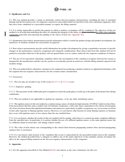SIGNIFICANCE AND USE 5.1 This test method provides a means to determine various fire-test-response characteristics, including the time to sustained flaming and the heat release rate, of composites exposed to a prescribed initial test heat flux in the cone calorimeter apparatus, after they have been vandalized in a prescribed manner, to expose the filling material. 5.2 It is clearly impossible to predict the manner in which a mattress or furniture will be vandalized. The objective of this test method is to develop data indicating the effect of violating the integrity of the fabric (or the fabric plus interliner composite) protection and exposing the padding to the source of heat (see Appendix X3). 5.3 Quantitative heat release measurements provide information which is useful for product design and product development, for mattresses or furniture destined for correctional occupancies. 5.4 Heat release measurements provide useful information for product development by giving a quantitative measure of specific changes in fire performance caused by component and composite modifications. Heat release data from this method will not be predictive of product behavior if the product will not spread flame over its surface under the fire exposure conditions of interest. 5.5 The use of test specimens simulating vandalism allows the investigation of the variation in response between the system as designed by the manufacturer and the way the system is occasionally present in actual use, with the filling material exposed to the incident energy. 5.6 This test method allows alternative strategies to be employed for producing a product (mattress or upholstered furniture) with the required fire-test-response characteristics for the scenario under consideration. 5.7 Limitations: 5.7.1 The test data are invalid if any of the events in 5.7.1.1 or 5.7.1.2 occur. 5.7.1.1 Explosive spalling. 5.7.1.2 The specimen swells sufficiently prior to ignition to touch the spark plug or swells up ... SCOPE 1.1 This fire-test-response test method is designed for use to determine various fire-test-response characteristics, including ignitability and heat release rate, from composites of mattresses or furniture, or correctional facilities, which have been vandalized in a prescribed manner to expose the filling material, by using a bench scale oxygen consumption calorimeter. 1.2 This test method provides for measurements of the time to sustained flaming, heat release rate, peak and total heat release, and effective heat of combustion at a constant radiant initial test heat flux of 35 kW/m2. See 5.7 for limitations. 1.3 The apparatus used in this test method is also capable of determining heat release data at different initial test heat fluxes. 1.4 The specimen is oriented horizontally and a spark ignition source is used. 1.5 All fire-test-response characteristics are determined using the apparatus and the procedures described in Test Method E1354. 1.6 The tests are done on bench-scale specimens combining the mattress or furniture outer layer components. Frame elements are not included. 1.7 The vandalism is simulated by causing a prescribed cut on the outer layer of the composite, deep enough to expose the filling material to the incident radiation. 1.8 The values stated in SI units are to be regarded as standard. No other units of measurement are included in this standard. 1.9 This standard is used to measure and describe the response of materials, products, or assemblies to heat and flame under controlled conditions, but does not by itself incorporate all factors required for fire hazard or fire risk assessment of the materials, products, or assemblies under actual fire conditions. 1.10 This standard does not purport to address all of the safety concerns, if any, associated with its use. It is the responsibility of the user of this standard to establish appropriate safety, health, and environmental ...