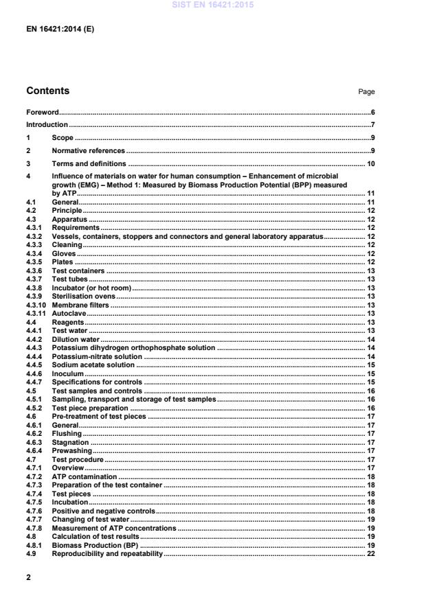 Method 1: Measured by Biomass Production Potential (BPP) measured by ATP – Protocol of ATP analysis . 50 B.1 Introduction . 50 B.2 Apparatus and glassware . 50 B.3 Reagents and auxiliary substances . 50 B.3.1 General . 50 B.3.2 Sterile water . 50 B.3.3 ATP solutions for standard dilutions and calibration curves . 50 B.3.4 Luciferin/luciferase (enzyme) solution . 51 B.3.5 ATP extraction reagent . 52 B.4 Sampling . 52 B.5 Procedure . 52 B.5.1 General . 52 B.5.2 Blank water . 52 B.5.3 Control dilutions . 52 B.5.4 Samples . 52 B.6 Expression of results . 52 B.6.1 Water samples . 52 B.6.2 Material samples . 53 B.7 Test record . 53 SIST EN 16421:2015