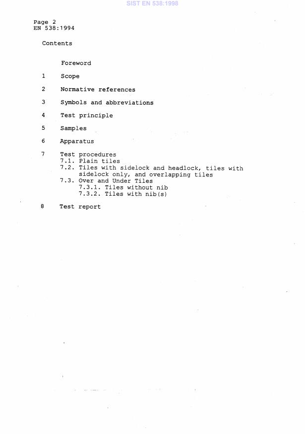 EN 538:1994 - titled Clay roofing tiles for discontinuous laying - Flexural strength test - is a European Standard published by CEN that defines a laboratory test method to evaluate the flexural strength (bending resistance) of clay roofing tiles intended for discontinuous (overlapping) laying. The standard is referenced by product specification standards for clay roofing tiles (noted in the text as EN YY - Clay roofing tiles - Product definitions and specifications) and has been adopted by national bodies (for example as SIST EN 538:1998).