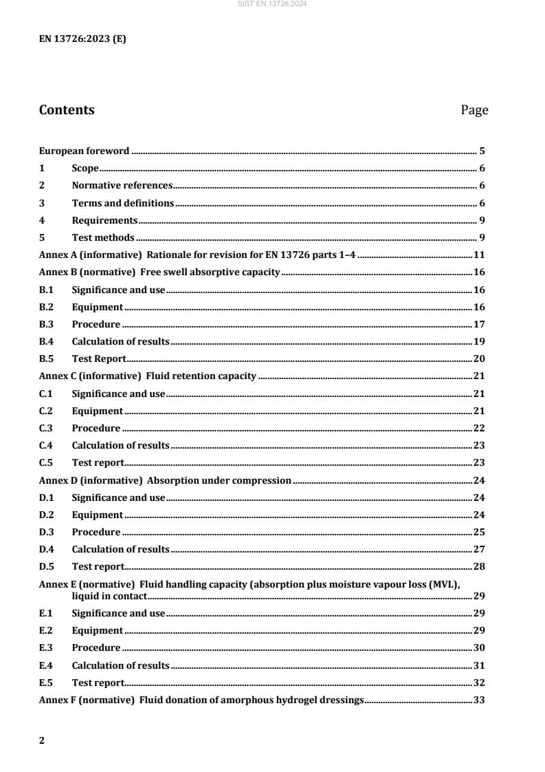 EN 13726:2023 (identical to EN 13726:2023) specifies standardized test methods for wound dressings focusing on key functional aspects: absorption, moisture vapour transmission, waterproofness, and extensibility. The document merges previous EN 13726 parts into a single European standard and provides both normative and informative annexes describing procedures, equipment and reporting for standardized performance testing of wound care products.