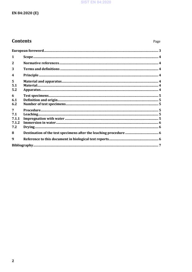 EN 84:2020 is a standard published by the European Committee for Standardization (CEN). Its full title is "Durability of wood and wood-based products - Accelerated ageing of treated wood prior to biological testing - Leaching procedure". This standard covers: This document specifies a method for leaching, applicable to test specimens of wood or wood-based products which are subsequently subjected to biological tests. This document is applicable to: a) the pre-conditioning of test specimens prior to their being subjected to a biological test; or b) assessment of loss of effectiveness by comparing the performance in a biological test of treated test specimens subjected to this procedure with others that have not undergone any leaching procedure. NOTE The method can also be used for pre-conditioning of untreated wood, modified wood and wood-based panel products, whether they received preservative treatment or not.