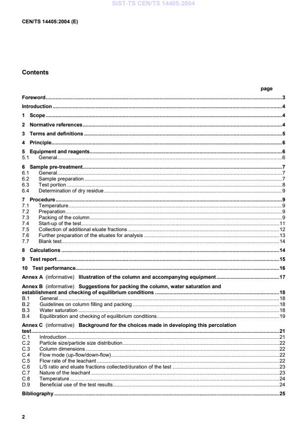 CEN/TS 14405:2004 is a technical specification published by the European Committee for Standardization (CEN). Its full title is "Characterization of waste - Leaching behaviour tests - Up-flow percolation test (under specified conditions)". This standard covers: This Technical Specification is applicable to determine the leaching behaviour of inorganic constituents from granular waste (without or with size reduction (see 6.2)). The waste body is subjected to percolation with water as a function of liquid to solid ratio under specified percolation conditions. The waste is leached under hydraulically dynamic conditions. The method is a once-through column leaching test and the test results establish the distinction between different release patterns, for instance wash-out and release under the influence of interaction with the matrix, when approaching local equilibrium between waste and leachant. NOTE 1 The mentioned specified percolation conditions are arbitrary and are not simulating a specific scenario. NOTE 2 Waste materials that show a saturated hydraulic conductivity between 10-7 m/s and 10-8 m/s can be subjected to this test, but it can be difficult to maintain the imposed flow rate. If a waste shows a saturated hydraulic conductivity below 10 -8 m/s, the test should not be carried out. (See C.5 for a definition of �hydraulic conductivity�.) NOTE 3 This procedure is generally not applicable to biologically degrading materials and materials reacting with the leachant, leading, for example, to excessive gas emission or excessive heat release. NOTE 4 This procedure is applicable to materials showing solidification in the column, if the final hydraulic conductivity is within the specified range (see NOTE 1).