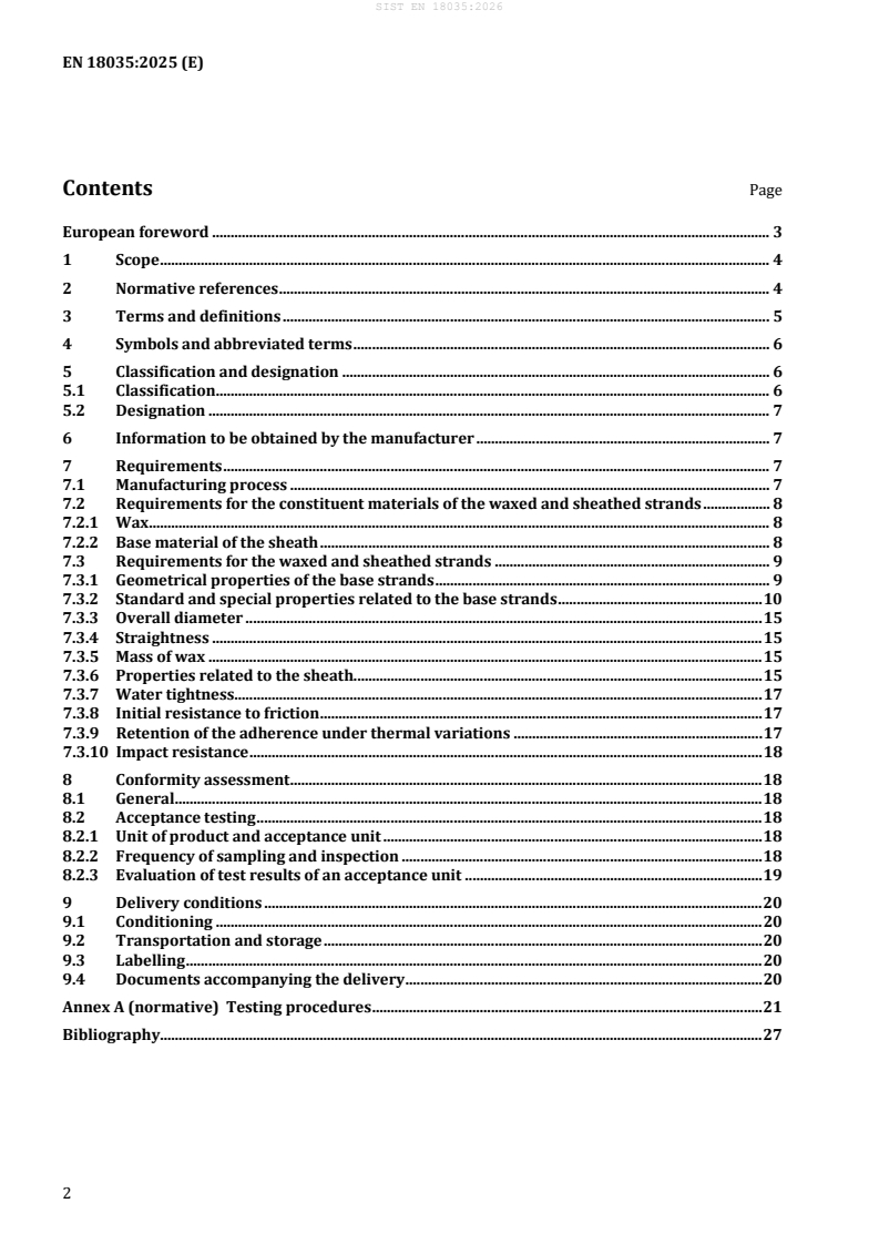 EN 18035:2025 is a standard published by the European Committee for Standardization (CEN). Its full title is "Prestressing steels - Waxed and sheathed strands for construction applications". This standard covers: This document specifies the requirements for uncoated high strength steel strands of zinc or zinc alloy coated high strength steel strands, encapsulated with wax and a sheath for construction applications. The document applies only to products as supplied by the manufacturer.