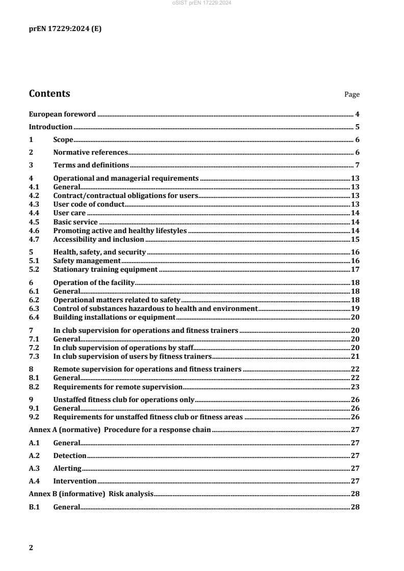 EN 17229:2025 is a draft published by the European Committee for Standardization (CEN). Its full title is "Fitness clubs - Requirements for amenities and operation - Operational and managerial requirements". This standard covers: This document specifies the minimum requirements for the provision of physical exercise by fitness clubs. This includes the operational, managerial, and supervision requirements in the delivery of both within and any externally related services offered by fitness clubs, together with the selection and positioning of exercise equipment, the essential skills required by fitness trainers, and any associated environmental and procedural requirements for safe physical exercising to take place. This document is applicable to all publicly accessible fitness clubs where exercising in groups or individually takes place and is irrespective of the size of the club. It is intended to provide a healthy, safe and secure environment for its users, including through the use of digital technologies. This document is applicable to fitness clubs publicly available and open to user subscription or pay-as-you-go services. This document does not cover clubs that are exclusively secondary businesses and offered in addition or as a complement to their primary service. NOTE In the event that the fitness club is expected to be accessible to people with special needs (e.g. people with a disability and/or impairments, minors, etc.), attention is drawn to any relevant national guidelines.