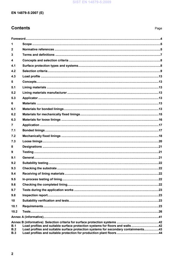 Contents Page Foreword.4 1 Scope.5 2 Normative references.5 3 Terms and definitions.7 4 Concepts and selection criteria.8 4.1 Surface protection types and systems.8 4.2 Selection criteria.9 4.3 Load profile.13 5 Concepts.13 5.1 Lining materials.13 5.2 Lining materials manufacturer.13 5.3 Applicator.13 6 Materials.13 6.1 Materials for bonded linings.13 6.2 Materials for mechanically fixed linings.15 6.3 Materials for loose linings.16 7 Application.17 7.1 Bonded linings.17 7.2 Mechanically fixed linings.18 7.3 Loose linings.20 8 Designations.21 9 Testing.21 9.1 General.21 9.2 Suitability testing.22 9.3 Checking the substrate.22 9.4 Receiving of lining materials.22 9.5 In-process testing of lining.22 9.6 Checking the completed lining.22 9.7 Tests during the application works.23 9.8 Inspection report.23 10 Suitability verification and tests.23 10.1 Requirements.23 10.2 Tests.26 Annex A (informative).41 Annex B (informative)