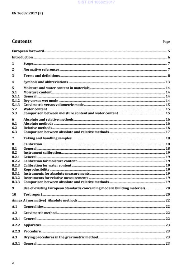 Ta evropski standard so navodila, ki določajo ustrezne metodologije za merjenje vsebnosti vlage v materialih sestavov premične in nepremične, zunanje ali notranje kulturne dediščine za namene ohranjanja. Namenjen je za pomoč uporabnikom pri izbiri najustreznejšega sistema za pridobivanje zanesljivih meritev za potrebe ohranjanja. Navaja, kako se lahko vsebnost vlage meri neposredno ali posredno, t.j. razlikovanje med brezstičnimi in stičnimi, neinvazivnimi in invazivnimi, neporušitvenimi in porušitvenimi metodologijami, kdaj so metodologije sprejemljive in kdaj niso (z vidika ohranjanja). Prikazane so prednosti in slabosti posameznih merilnih sistemov. Za vsak merilni sistem so predstavljeni negotovosti in dejavniki, ki lahko vplivajo na odčitke in njihovo razlago. Ta evropski standard bo zagotovil nasvete in podporo pri zahtevnejših zadevah.