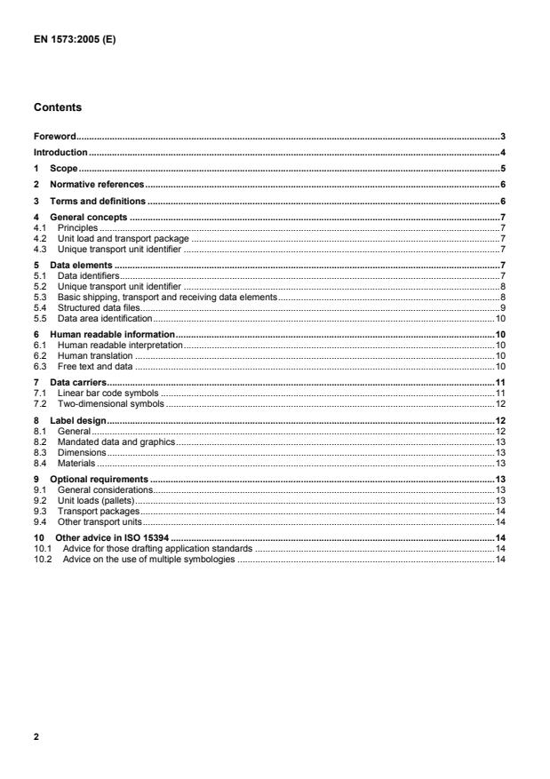prEN 1573 is a draft published by the European Committee for Standardization (CEN). Its full title is "Bar code - Multi industry transport label". This standard covers: This European Standard: · specifies the general requirements for the design of transport labels containing linear bar code and two-dimensional symbols for use by a wide range of industries; · provides for traceability of transported units via a unique transport unit identifier code or 'licence plate', and supplemented where necessary by other identified data presented both in bar code and human readable form; · provides a choice of linear bar code and two-dimensional symbologies; · specifies quality requirements, classes of bar code density; · provides recommendations as to label material, size and the inclusion of free text and any appropriate graphics. This European Standard draws considerably on the content of ISO 15394:2000. As such, common material will not be repeated here but detailed references will be provided to that standard. However, this European Standard: · Defines some features in a more precise manner for use in the European context. · Provides additional advice possible since the publication of ISO 15394:2000. This European Standard can be used as the single source, sufficient for an overview and to enable information flows to be incorporated into business systems. ISO 15394 is more relevant to those who are undertaking detailed label design, particularly compliant label generating software.