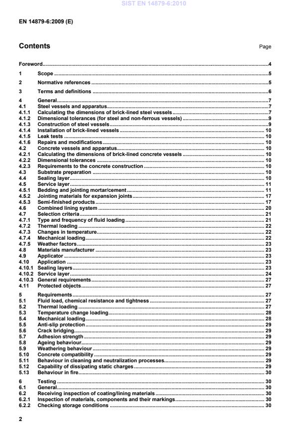 At this time no regulated specifications exist. Admissible deviations shall be agreed with the manufacturer of the brick lining. 4.2.3 Requirements to the concrete construction Requirements to the concrete construction and surface shall be in accordance to EN 14879-1. 4.3 Substrate preparation For preparation of substrate see EN 14879-1. 4.4 Sealing layer The sealing layer shall be either a coating according to EN 14879-2 and/or EN 14879-3 or a lining according to EN 14879-4 and/or EN 14879-5. The sealing layer of a combined lining system serves as a sealing of the component and crack bridging of the concrete. Since in most cases the service layer also protects the sealing layer from direct exposure to chemi-cal, mechanical or thermal loads, the suitability may only be determined by testing the system as a whole. Taking into consideration the particular requirement and the expected life the combination of sealing layer and service layer that has the best all-around resistance shall be selected. As a rule, the system shall be designed either for the expected loads or (in special cases) for higher loads than expected. SIST EN 14879-6:2010