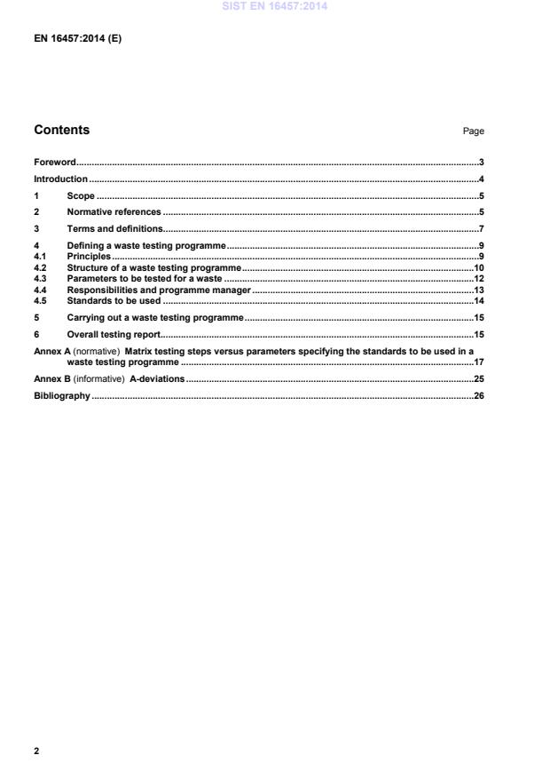 Introduction This European Standard was elaborated as a help for those who have to organize and apply a waste testing programme. Often several parameters need to be determined in a waste sample and for each parameter different testing steps of a different nature need to be coordinated and performed. This is done in accordance with dedicated standards developed by CEN/TC 292 (e.g. standards for the steps of sampling, extraction, leaching and analysis of eluates or extracts). In order to cope with these different parameters to be tested and with these different testing steps of different nature, the testing of a waste generally refers to different standards which should be used (and elaborated) in a coherent and coordinated way in a testing programme. This European Standard is designed for specifying such overall testing programmes. This European Standard may be used by different interested parties in waste testing: plant operators, testing institutes, accreditation bodies, etc. as well as by industries to address the waste testing part of their contracts and by regulators to address the waste testing part of their regulations. This European Standard can be used to: — produce a standardized testing programme for use in regular or routine circumstances (elaboration of daughter/derived standards dedicated to well defined testing scenarios); — incorporate the specific testing requirements of European and national legislation; — design and develop a waste testing programme for use on a case by case basis. This European Standard provides requirements on the programme, objective, plan and report for the execution of a waste testing programme. This is done with the intent to ensure reliable and comparable results when using the reference methods that have been developed by CEN/TC 292 in accordance with the principles specified in this standard and in the supporting documents (listed below). As shown in Figures 2 and 3, for waste testing, the tests to be performed consist (see also the supporting documents listed below) of two main works: the sampling in the field and the analysis-quantification in the laboratory. The needed coordination and interface is the responsibility of the programme manager (see 4.4). It is also the responsibility of the programme manager to design the testing programme, to authorize the testing report and to submit it to the customer. This European Standard includes one normative annex and one informative annex which are part of this standard. This European Standard is intended to become a part of a set of documents consisting of the present document: — EN 16457, Characterization of waste – Framework for the preparation and application of a testing programme – Objective, planning and report and of three supporting documents providing important information: — CEN/TS (WI 00292082), Characterization of waste – Framework for the preparation and application of a testing programme – Application of EN ISO/IEC 17025 (in preparation) — CEN/TS (WI 00292085), Characterization of waste – Framework for the preparation and application of a testing programme – Guidelines for the elaboration of standardised testing methods (in preparation) — CEN/TR (WI 00292084), Characterization of waste – Framework for the preparation and application of a testing programme – General information on content tests and leaching tests (in preparation) SIST EN 16457:2014