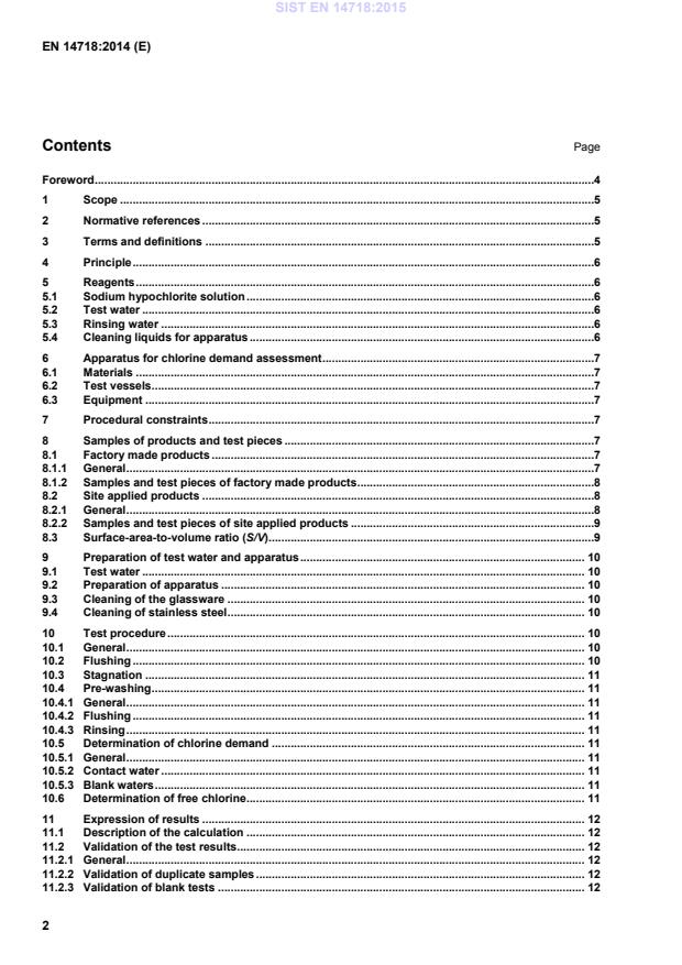 5 1 Scope This European Standard specifies a method for determining the chlorine demand of organic materials intended for use in contact with drinking water. This European Standard is applicable to factory made and site applied products used for the distribution, transport and storage of drinking water. This European Standard does not cover the use of high levels of chlorine to disinfect products when they are put into service. 2 Normative references The following documents, in whole or in part, are normatively referenced in this document and are indispensable for its application. For dated references, only the edition cited applies. For undated references, the latest edition of the referenced document (including any amendments) applies. EN ISO 7393-2:2000, Water quality - Determination of free chlorine and total chlorine - Part 2: Colorimetric method using N, N-diethyl-1, 4-phenylenediamine, for routine control purposes (ISO 7393-2:1985) 3 Terms and definitions For the purposes of this document, the following terms and definitions apply. 3.1 chlorine demand ability of a material in contact with chlorinated water to remove/reduce the concentration of free chlorine in the water compared with a reference sample [SOURCE: EN ISO 7393-2:2000, 2.1] 3.2 test water water used for testing purposes prepared with a free-chlorine content as described in 5.2 3.3 rinsing water test water without added chlorine 3.4 contact water test water (see 3.2) which has been in contact with a test piece under specified conditions 3.5 blank water test water (see 3.2) which has been kept at the same specified conditions (e.g. temperature, contact time, contact with any sealing material) as contact water but without contact with the test piece 3.6 flushing water tap water 3.7 product manufactured item, in its finished form SIST EN 14718:2015