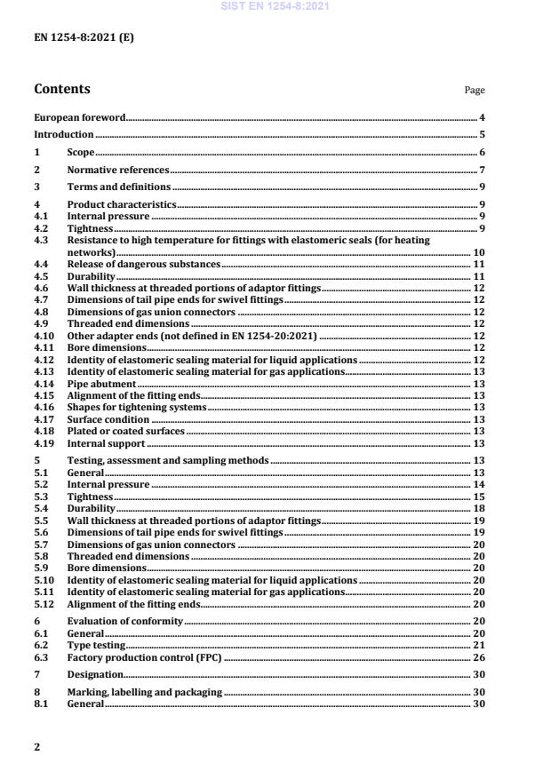 The article discusses the EN 1254-8:2021 standard which focuses on copper and copper alloy plumbing fittings. Specifically, it outlines the characteristics, assessment methods, compliance criteria, and designation system for fittings with radial and axial press ends. These fittings are designed for use with plastics and multilayer pipes, with a nominal diameter range of 10 mm to 160 mm. The document applies to copper alloy fittings, with a list of applicable alloys provided in CEN/TS 13388. It also mentions that adaptor fittings may combine press ends with fitting ends defined in other parts of EN 1254 and can have flanged end connections or a plated/decorative surface coating. The fittings can be produced using machining, metal forming, casting, or fabrication methods. The products covered by this standard are suitable for use in various liquid applications, such as hot/cold water systems, heating and cooling systems, drainage systems, fire protection systems, and supply systems for liquid fuels. They can also be used in gas applications, including natural gas and liquefied petroleum gas systems with a maximum operating pressure of 5 bar or less, as well as compressed air systems.