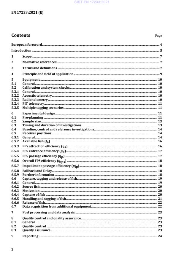 EN 17233:2021 is a standard published by the European Committee for Standardization (CEN). Its full title is "Water quality - Guidance for assessing the efficiency and related metrics of fish passage solutions using telemetry". This standard covers: This document specifies standardized methods for assessing the efficiency and related metrics of fish passage solutions using telemetry techniques that allow individual fish approaching an impediment to be monitored. It covers studies using fish that have been electronically tagged with acoustic, passive integrated transponder or radio tags in order to provide a variety of defined passage efficiency metrics and includes both upstream and downstream passage of fish. It provides recommendations and requirements for equipment, study design, data analysis and reporting. Selected literature with references in support of this document is given in the Bibliography.