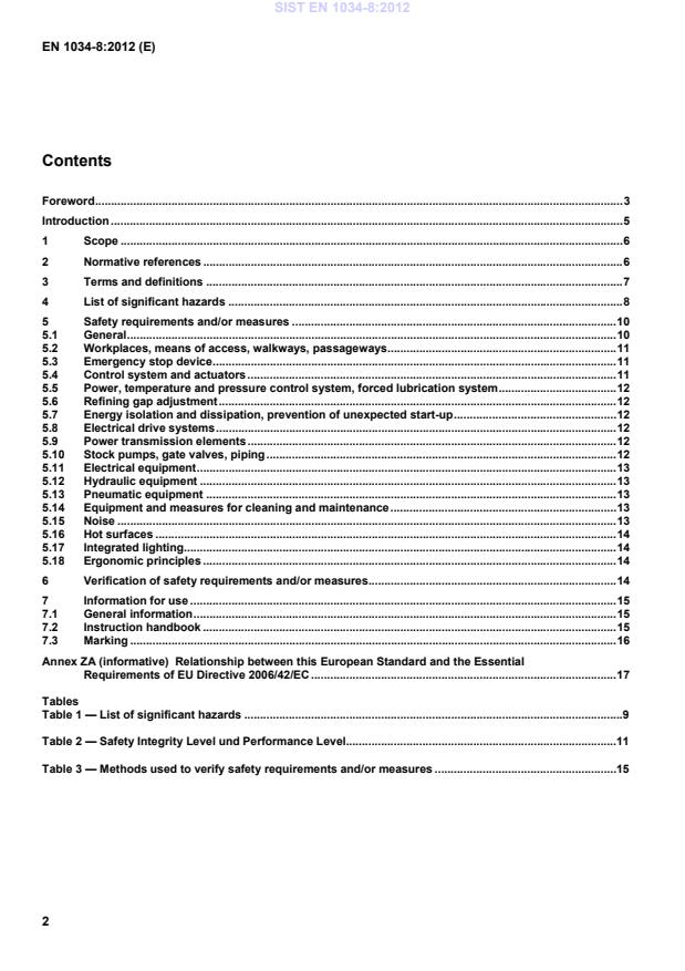 Relationship between this European Standard and the Essential Requirements of EU Directive 2006/42/EC . 17Tables Table 1 — List of significant hazards . 9Table 2 — Safety Integrity Level und Performance Level.11Table 3 — Methods used to verify safety requirements and/or measures .15 SIST EN 1034-8:2012