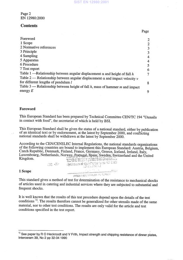 Keywords: EN 12980:2000, impact resistance, non-metallic articles, food contact materials, catering utensils, CEN standard, mechanical shocks, test method, quality control, testing labs.
