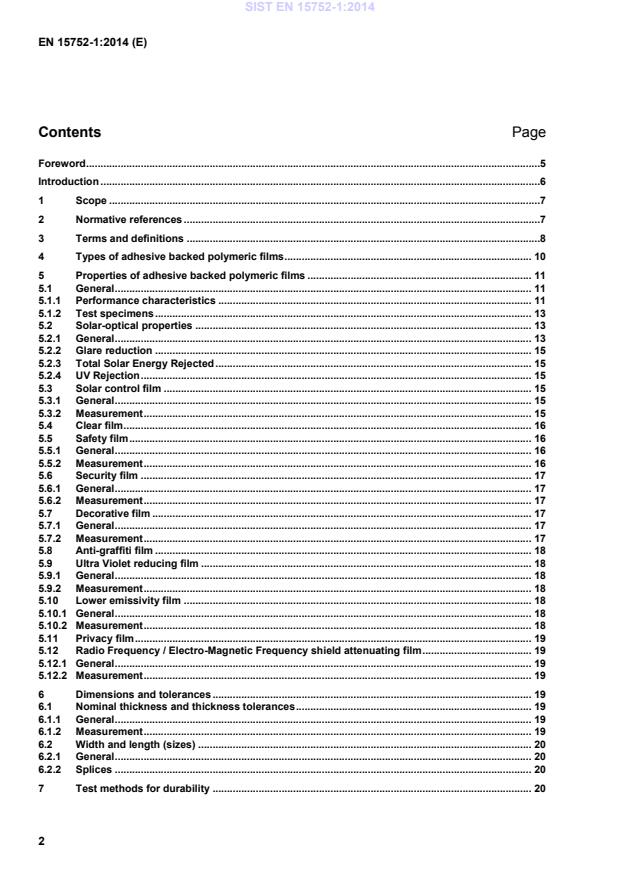 D1248 – An adhesive backed polymeric film designed to be applied to surface 2 of double glazing or surface 2 and / or surface 4 of triple glazing in order to modify the solar control, emissivity, privacy and EMI shielding of the glazing. 5.1.2 Test specimens The performance characteristics shall not be determined for the adhesive backed polymeric film alone, unless otherwise specified in this standard; performance characteristics shall be determined using test samples consisting of the adhesive backed polymeric film applied to clear, monolithic, uncoated float glass of nominal thickness of 4 mm. The glass shall be monolithic soda lime silicate and shall be in accordance with EN 572-1 and EN 572-2. One or more tests may be conducted on glass meeting these requirements but with a different thickness; these tests shall only be accepted if the same tests have been completed and reported in accordance with this standard for 4 mm thick glass. The adhesive backed polymeric film shall be applied to the glass substrate in accordance with the original manufacturer’s recommendations. Measurement of the properties of test specimens shall be made after the cure time has elapsed. The adhesive backed polymeric manufacturer should supply cure time requirements. Test specimens shall be representative of normal production material. Where the film shall be installed to a glass substrate in order to perform the test, the installation method shall be representative of the normal method used to install the adhesive backed polymeric film to the glass substrate. 5.2 Solar-optical properties 5.2.1 General Almost all adhesive backed polymeric films can be characterized directly for solar-optical properties. Properties specific to different types of adhesive backed polymeric films are considered in 5.3 to 5.12. The spectrophotometric properties shall be determined in accordance with EN 410 on a sample that is made up of adhesive backed polymeric film applied to clear monolithic float glass of 4 mm thickness, in accordance with the requirements in 5.1.2. If repeat measurements are required in order to obtain average values, measurements shall be made on separate samples prepared and constructed in identical manner. SIST EN 15752-1:2014