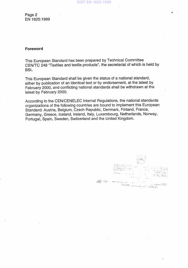 EN 1625:1999 is a standard published by the European Committee for Standardization (CEN). Its full title is "Textiles and textile products - Burning behaviour of industrial and technical textiles - Procedure to determine the ignitability of vertically oriented specimens". This standard covers: This European Standard specifies a procedure to determine the ignitability of vertically oriented specimens for industrial and technical textiles when tested according to EN ISO 6940.