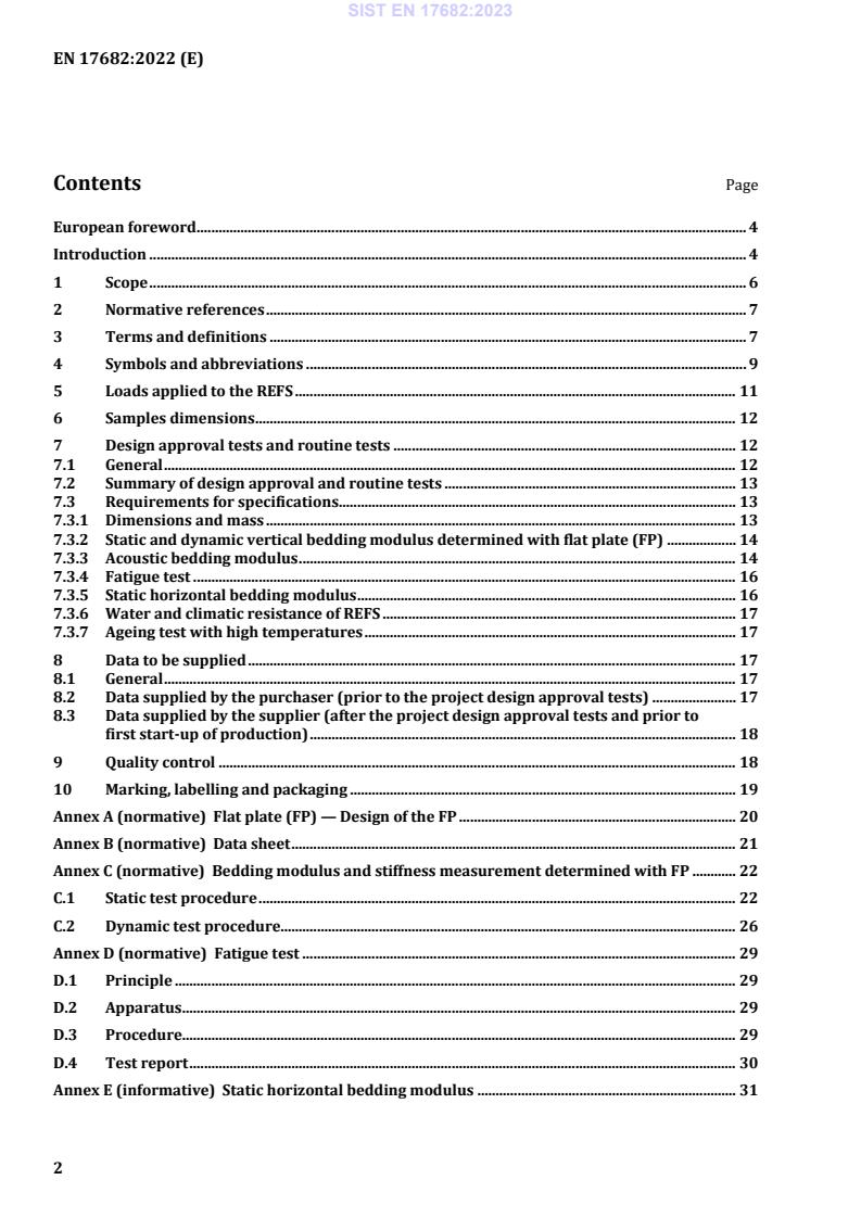 제목: EN 17682:2022 - 철도 응용 - 기반 시설 - 부동 슬랩 시스템용 탄력성 요소 내용: 본 문서는 부동 슬랩 시스템 (REFS)에 적용되는 탄력성 요소에 관한 것으로, 부동 슬랩에 사용되는 요소를 정의하고 시험 절차와 그의 인정 기준을 설명합니다. 본 문서는 진동을 완화하는 효과적인 트랙 구조와 관련된 파라미터들, 즉 진동과 고정구 소음을 감소시키는 파라미터들 뿐만 아니라 정적 분석과 트랙 안전성 검증을 위해 필요한 파라미터들에 대해서도 다룹니다. 트랙 베이스 플레이트와 트랙 트러프 형태의 부동 슬랩 트랙 시스템은 공학적 설계와 탄력성 요소 유형에 상당한 변동성이 있는 개별적인 솔루션입니다. 이러한 이유로, 부동 슬랩 트랙 시스템은 항상 고유한 공학적인 솔루션으로, 현재 문서에서 탄력성 요소에 대한 모든 구체적인 조건을 정의할 수 없습니다. 가장 일반적인 탄력성 요소의 종류는 다음과 같습니다: - 표면 베어링, - 스트립 베어링, - 불연속 베어링 (포함하여 나선형 강철 스프링 요소), - 수직 베어링. 본 문서는 다음 분야에서 특정 정보를 제공합니다: - 시험 방법, 시험 배열 및 인정 기준, - 구매자와 공급자로부터 제공되는 데이터, - 설계 승인 시험의 일반 과정 정의, - 일상적인 시험의 정의. 본 문서는 REFS에 대한 구체적인 시험 절차를 정의합니다: - 강도 시험, - 피로 시험, - 심한 환경 조건 시험. 본 문서는 또한 목적에 적합한 시험을위한 절차를 설명하며, 품질 보증 절차의 일부로 품질 모니터링에 대한 정보를 제공합니다. 하지만 본 문서는 부동 슬랩 시스템의 기능과 관련된 요구 사항을 포함하지 않습니다. 이러한 요구 사항을 정의하고 선택적인 시험을 선택하는 것은 구매자의 책임입니다. 본 문서는 패스팅 시스템이나 EN 13481 5로 포장된 부츠로 완성된 부패 콘크리트 블록 및 슬리퍼에는 적용되지 않습니다.